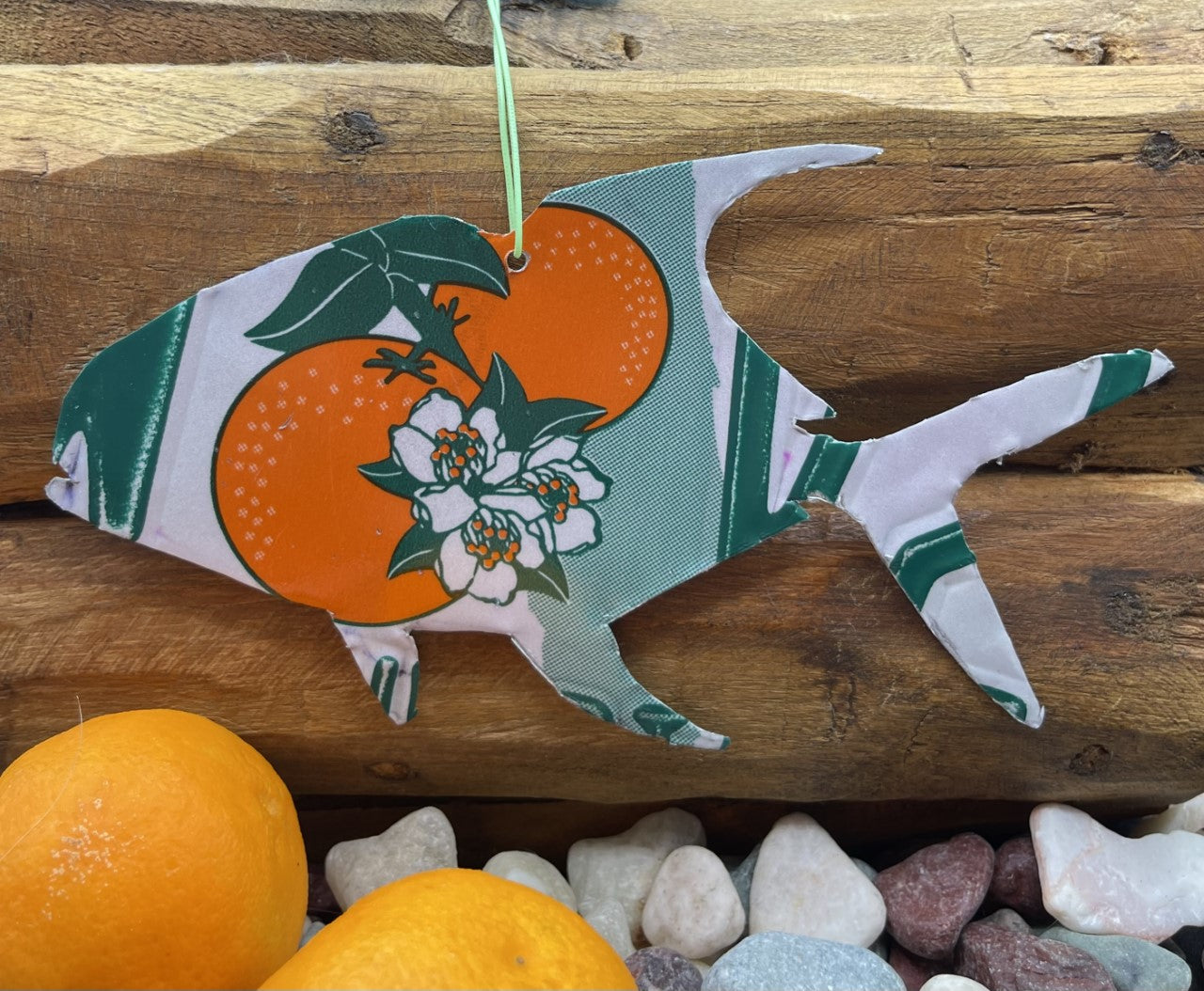 Compliment your holidays with a handmade Florida permit ornament made out of authentic modern license plates. These Florida orange blossom originals are artfully unique due to using a variety of license plates and are tied with a colorful fly line. This is a great holiday ornament, gift accessory, or accent piece for the fishing enthusiast. These fish are a limited edition and sell fast, so please place your orders today!