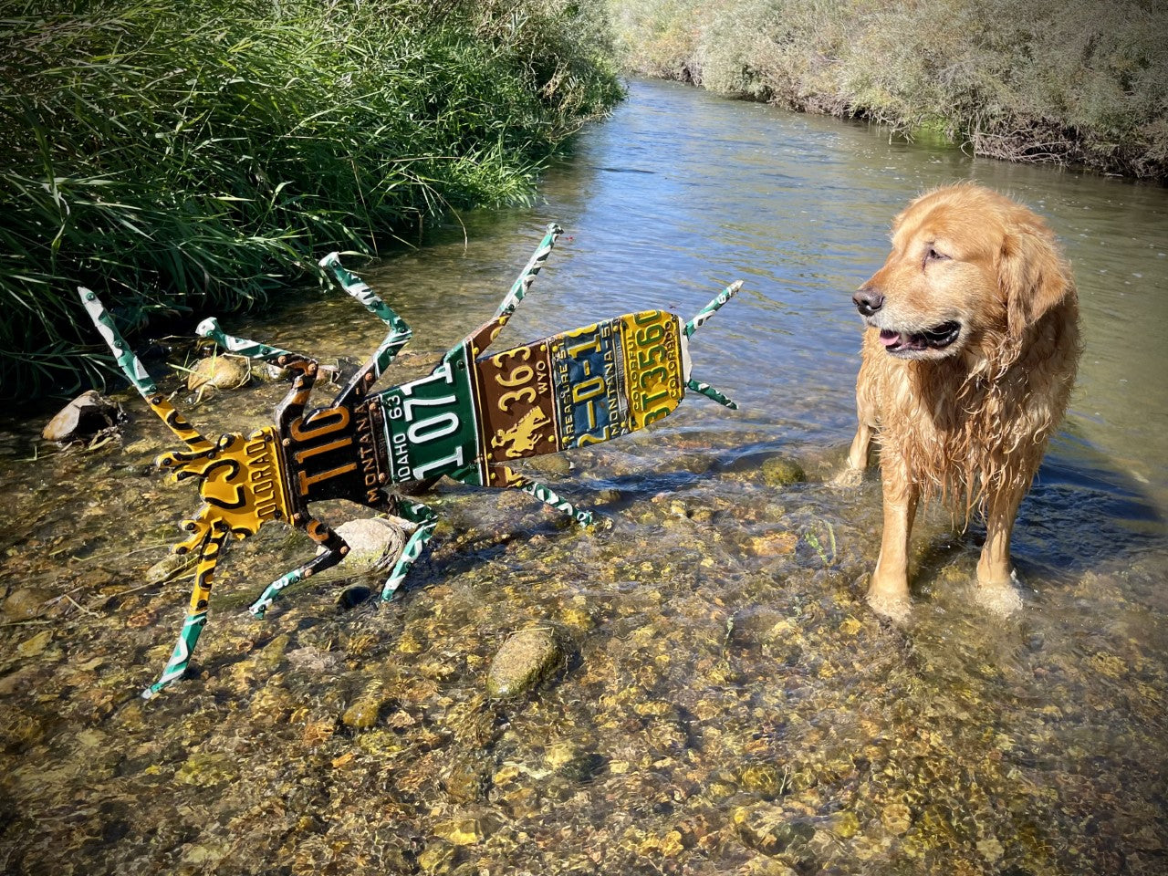 Celebrate those salmonfly hatches that we look forward to each year. Every license plate art piece is handmade and is unique. Yours will look very similar but will not be exactly the same as the photo example. The 100 pound golden retriever, Ranger, is there to help with sizing.
