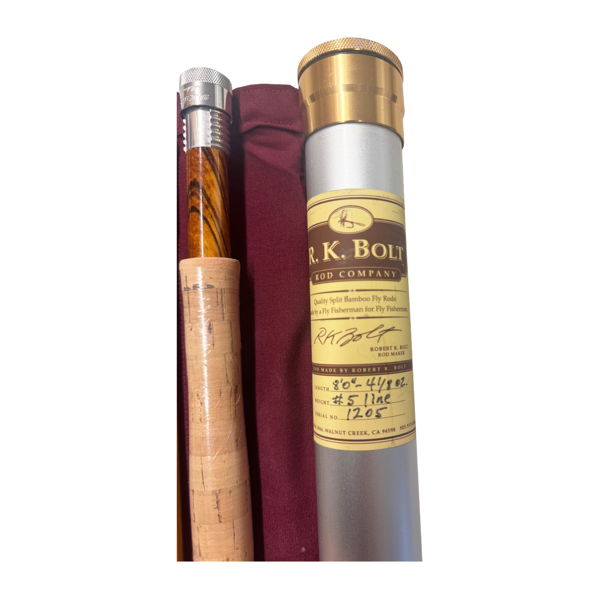 R.K. Bolt 5WT - 8'0" - 3pc w/Extra Tip #1205. Uplocking Reel Seat with beautiful Zebra Wood Spacer and Robert's Brass Ferrule Plugs.