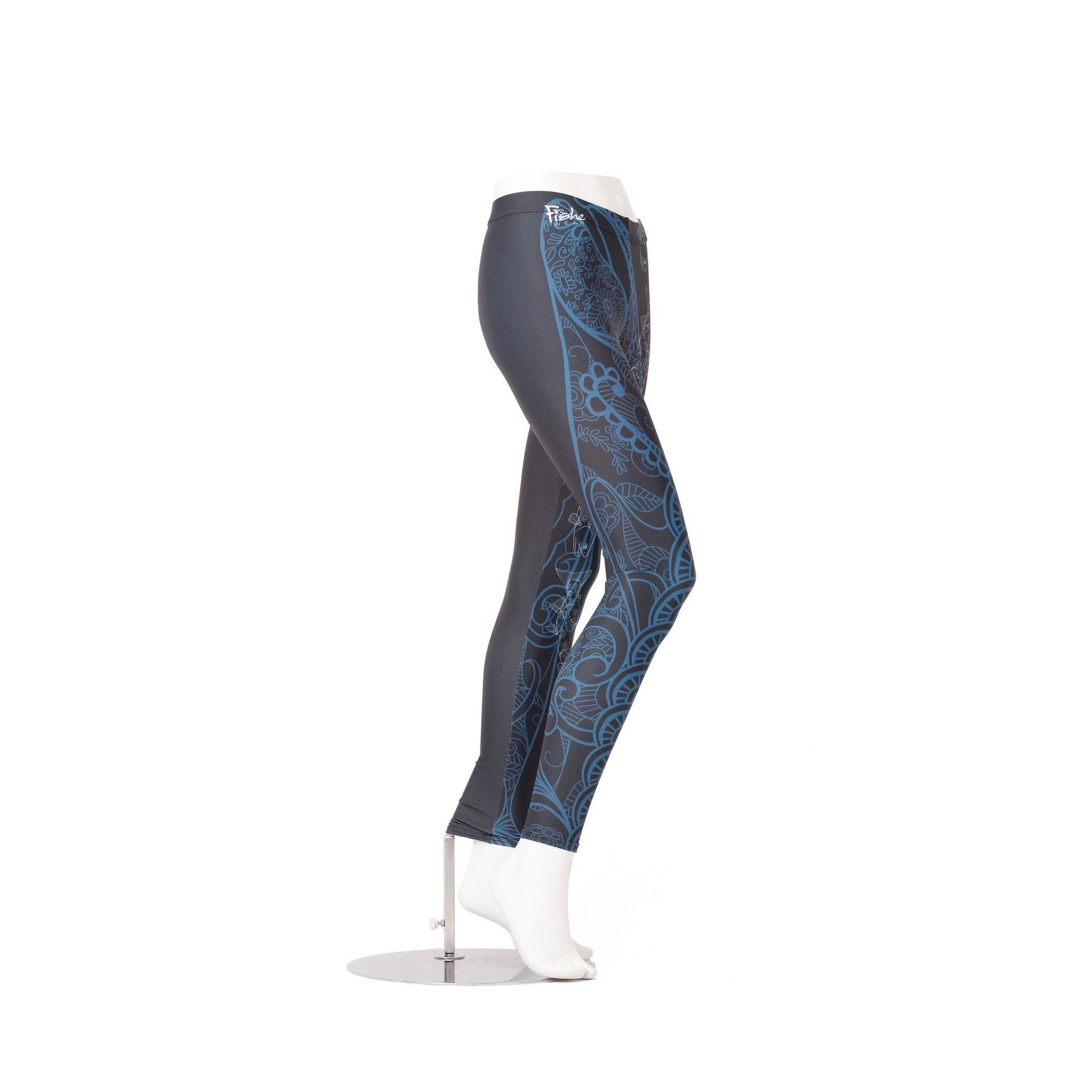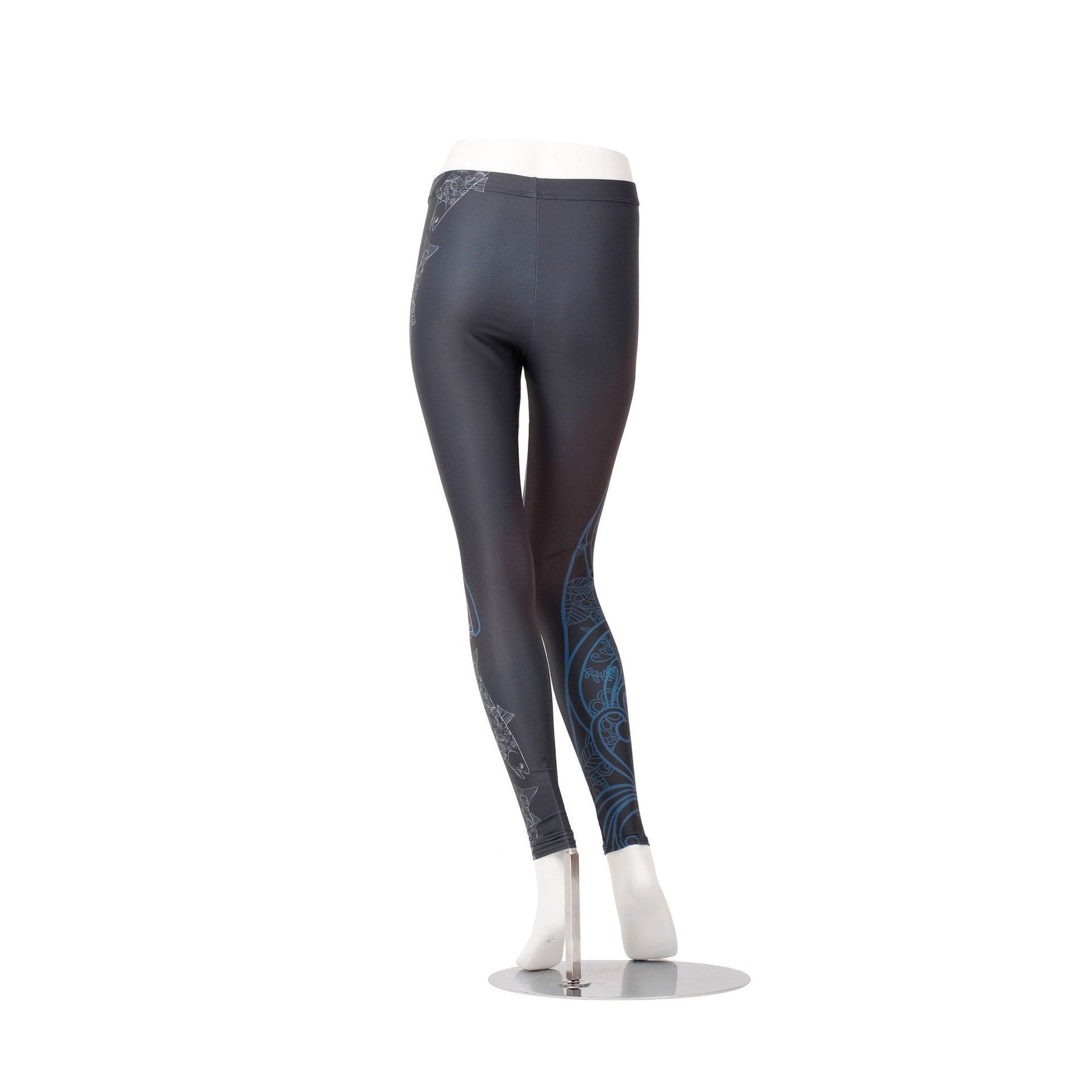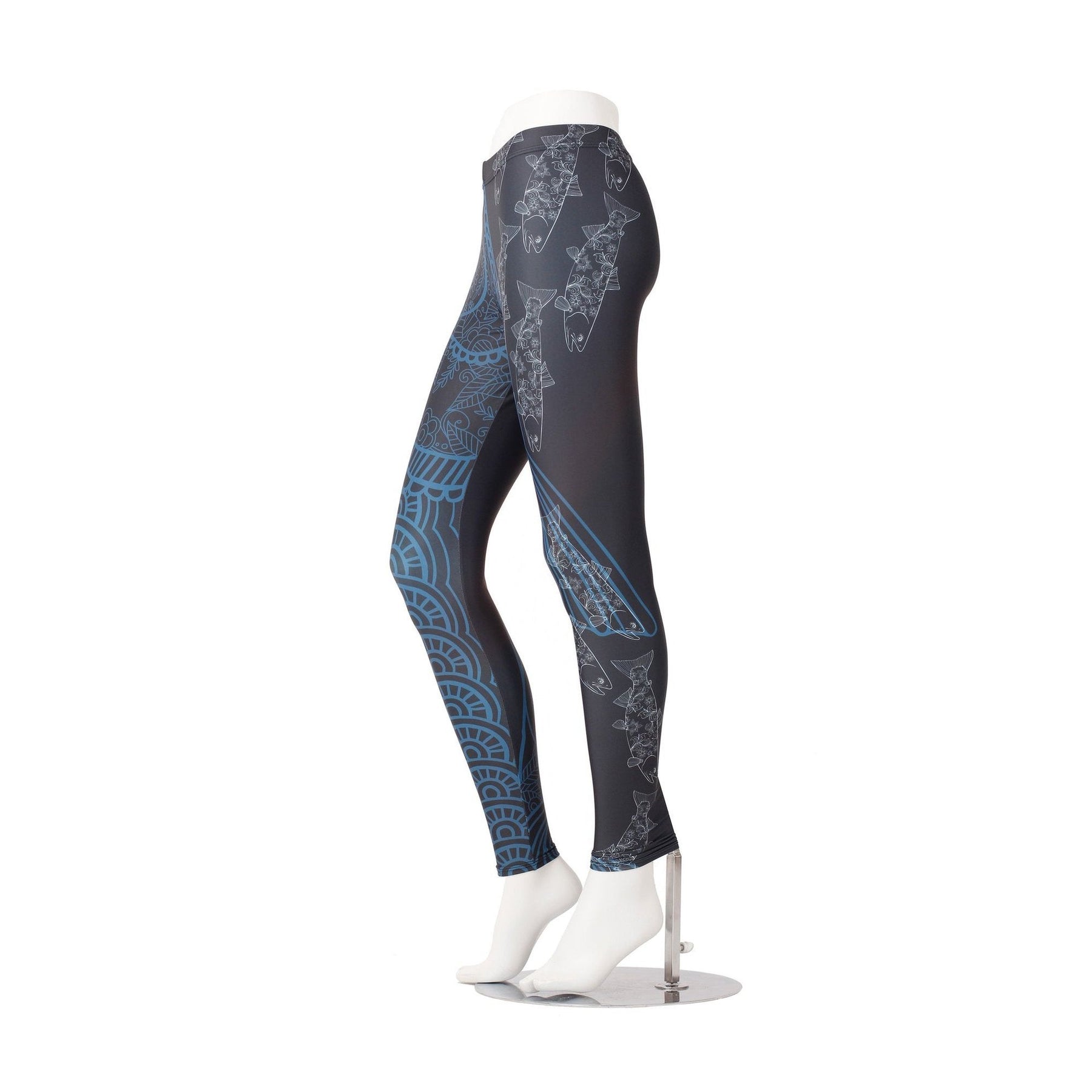 Using design elements from our Arctic Char, we created a base abstract pattern in navy blue. Overtop the navy blue swirls and patterns, a school of floral Arctic char fish swim down the right leg.