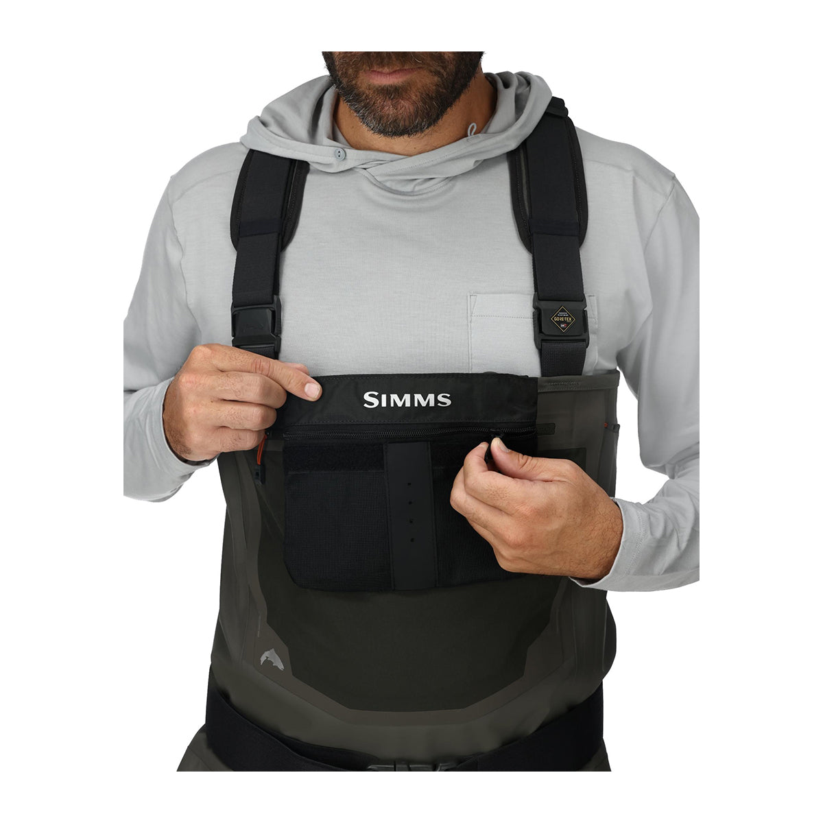 - Additional organization opportunities include a removable Tippet-Tender Pocket and zippered, stretch-woven internal pocket on wearer's left