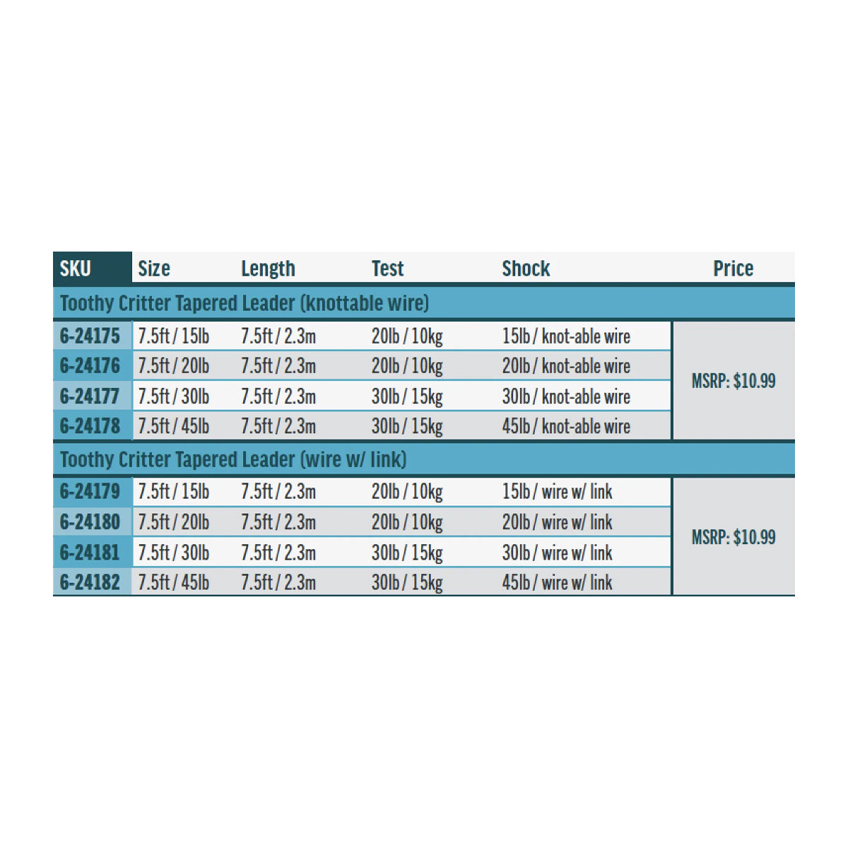 Available with 15 lb, 20 lb, 30 lb and 45 lb wire strength bite tippet. The 15 lb and 20 lb wire leaders are attached to a 20 lb class tapered leader, while the 30 lb and 45 lb wire bite tippet options are attached to a 30 lb class tapered leader.