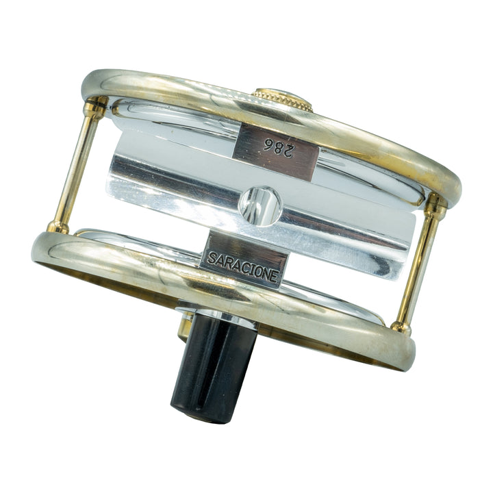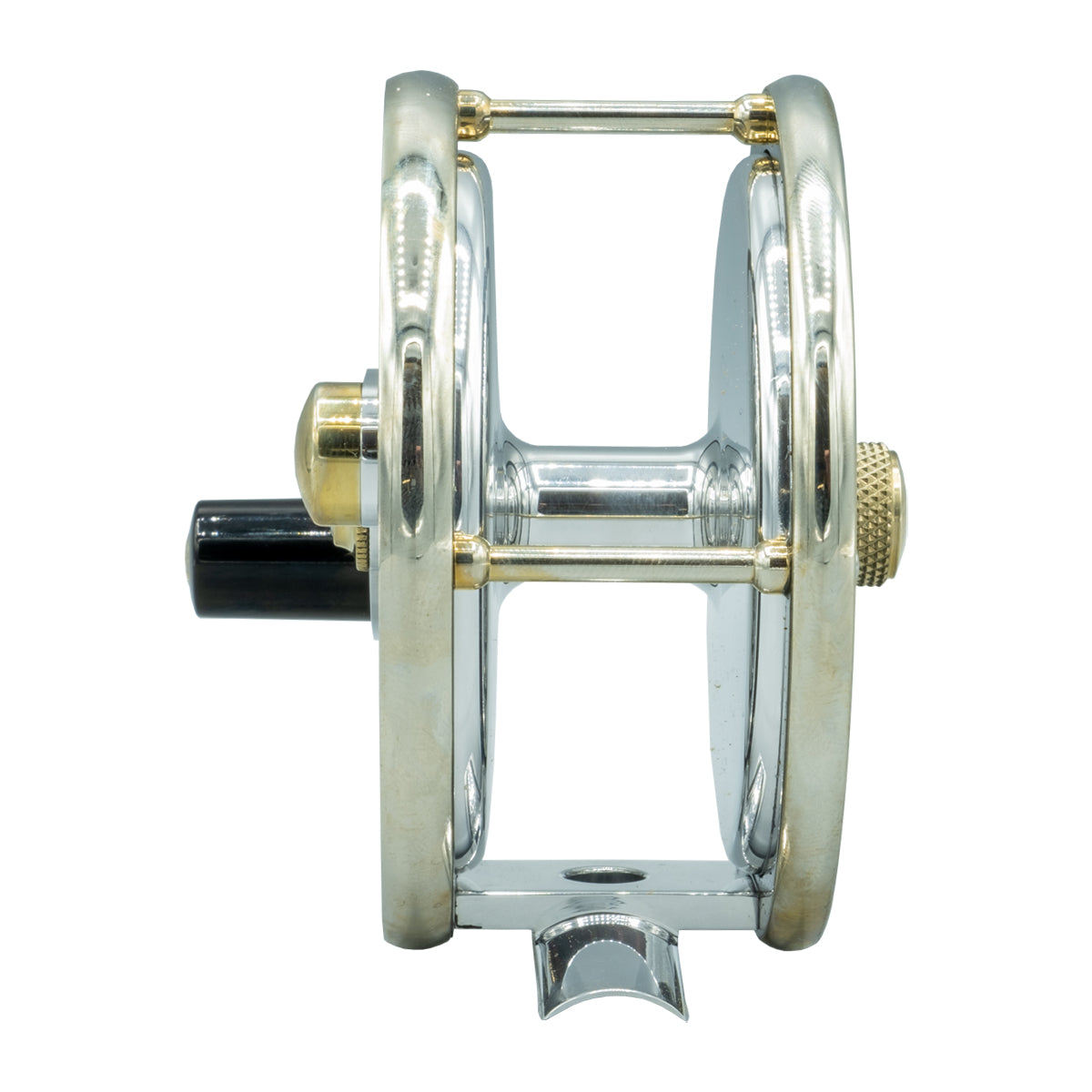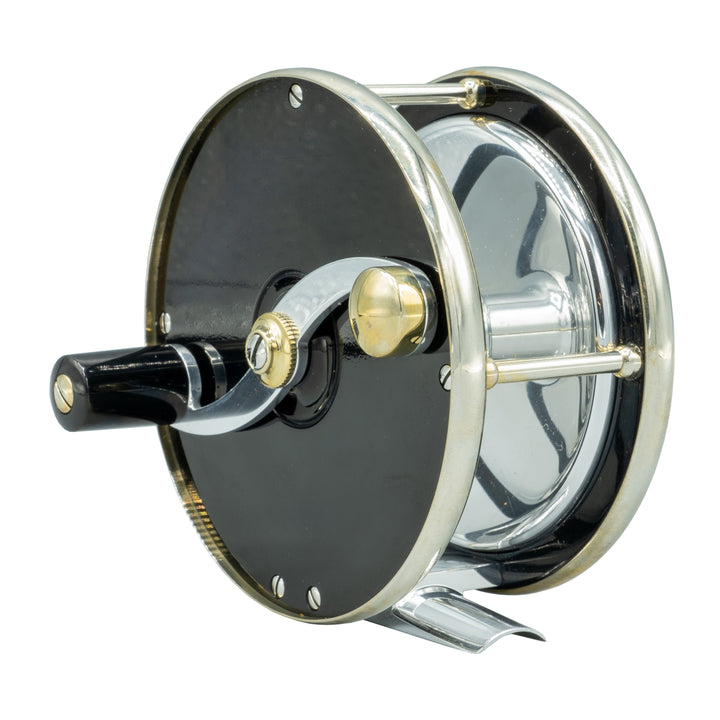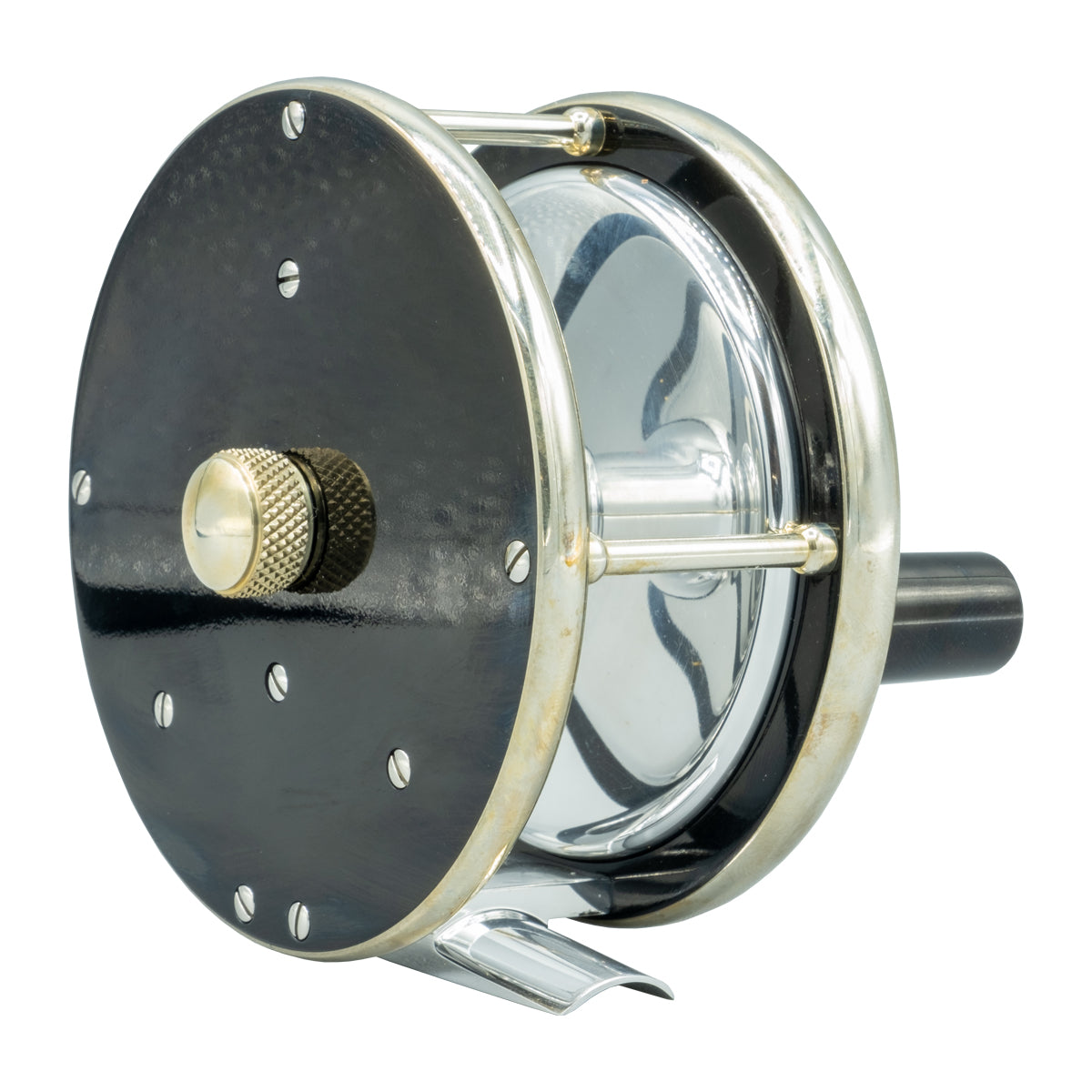 "Our Deluxe II reels are made in the old American tradition of Edward vomHofe reels with ebonite rubber side plates, German Silver protective side bands and an assortment of bronze, aluminum and stainless steel components. This is the reel that put SARACIONE on the map as a high grade collectable fly reel. This is not a reproduction of the vomHofe reels but more of vomHofe style reel. The drag system on the trout models is a preset gear and pawl drag, precisely set to control spool overrun. The assembly of spool-to frame fit is controlled with an adjustable side play mechanism like those found on better bait casting reels. These reels are the perfect match for high grade bamboo rods where the "Classic S handle" reel just looks and feels at home."