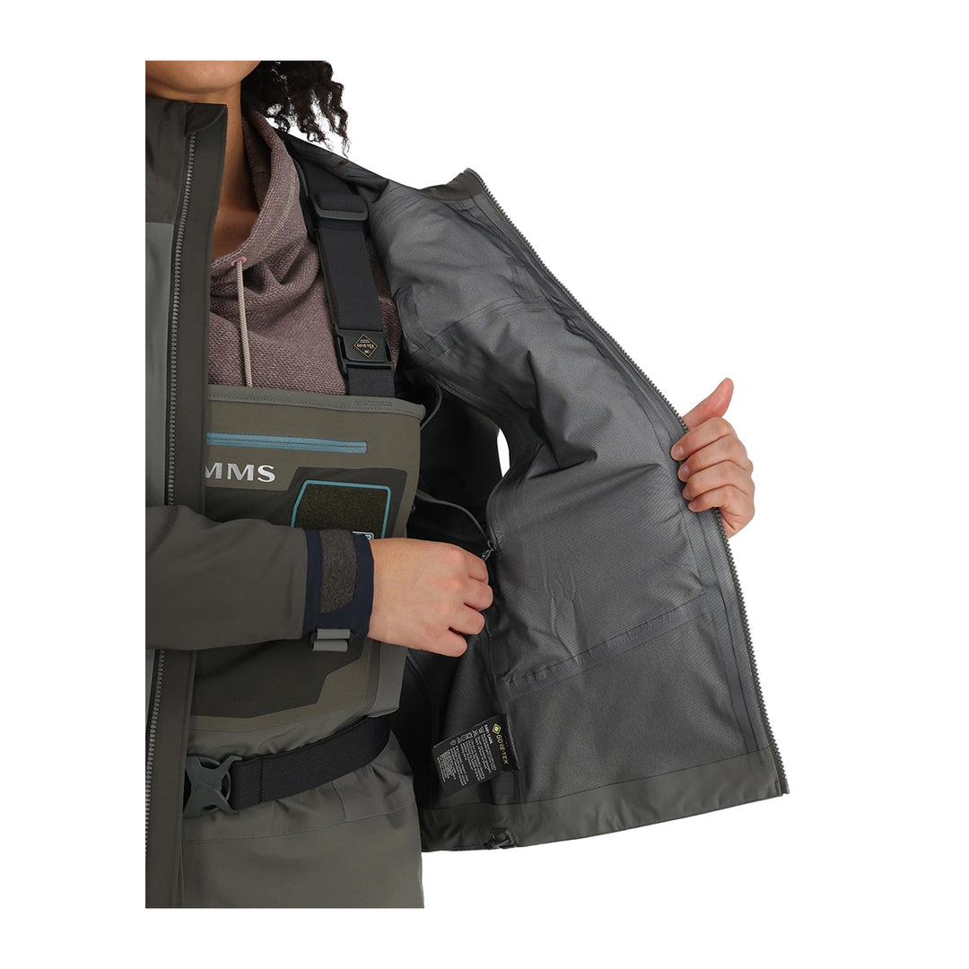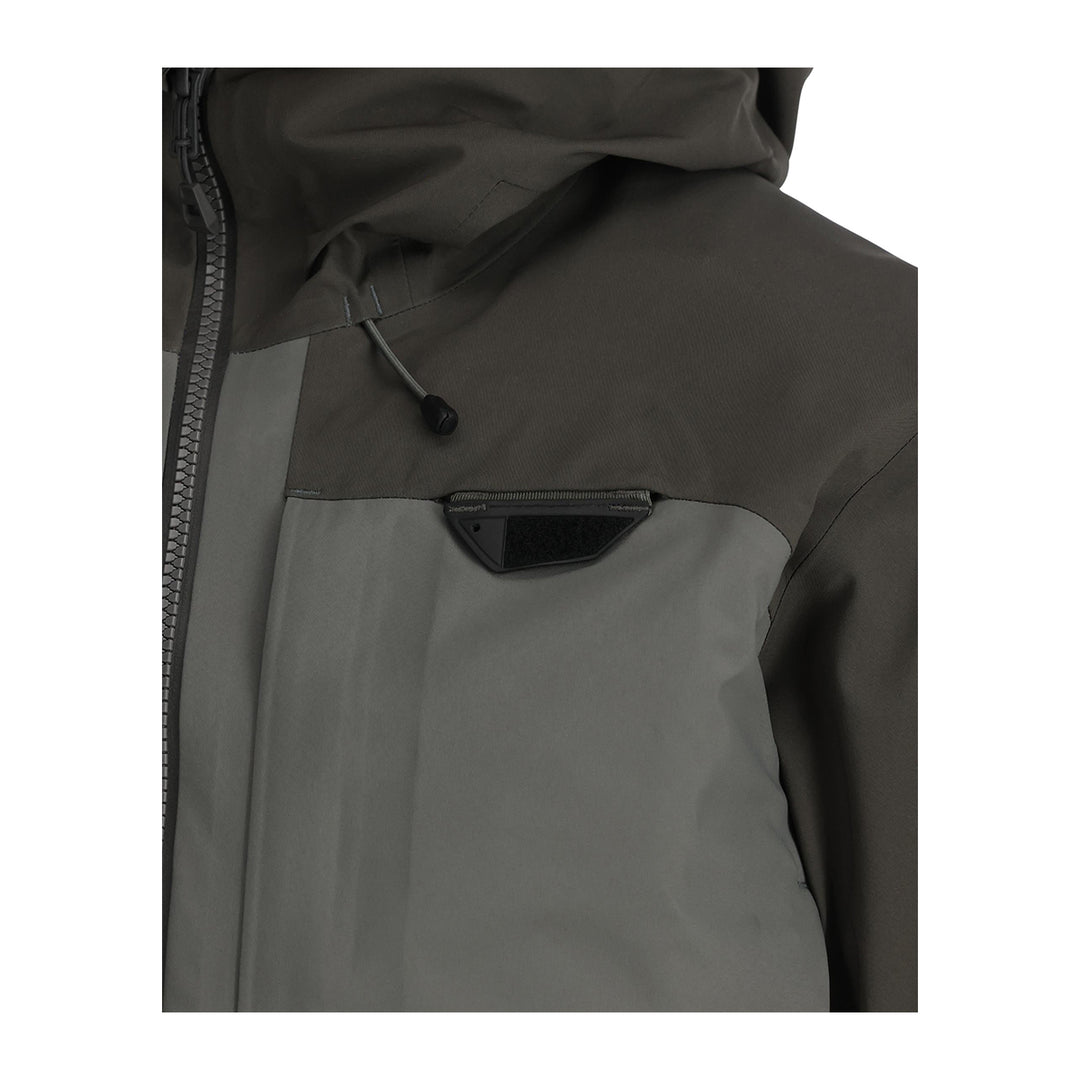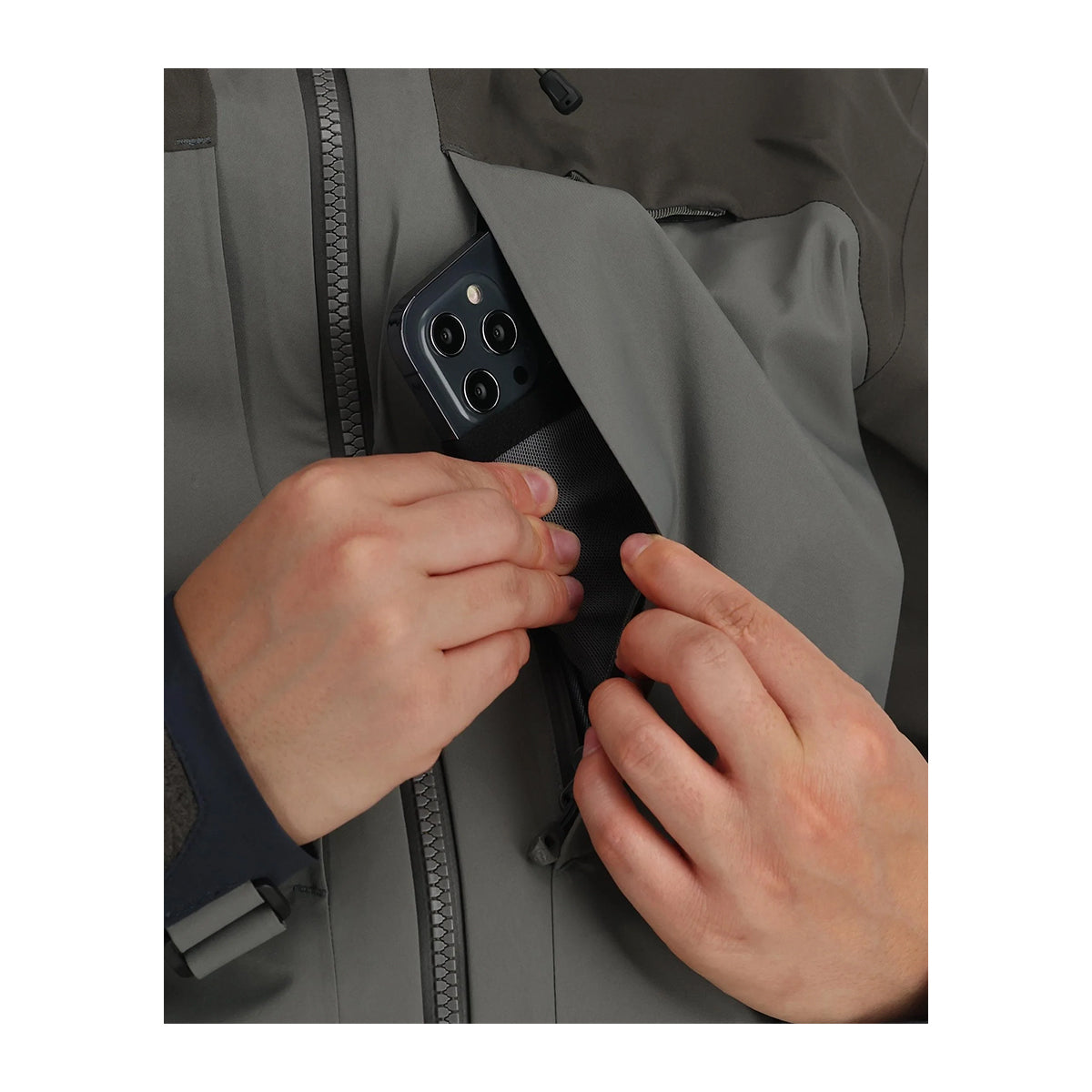 - Dual zippered handwarmer pockets are set high on the body to prevent water from entering during deep wading situations with pass-through zippers to access waders or bibs underneath
