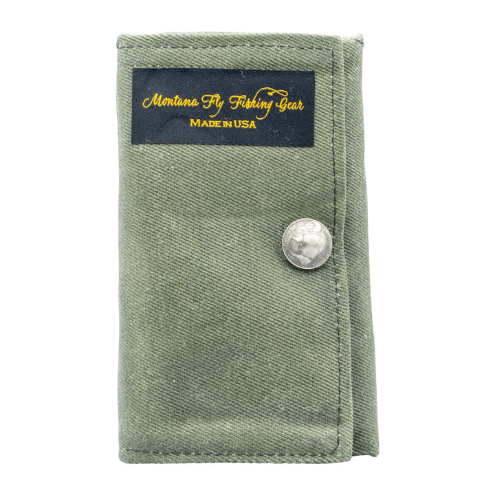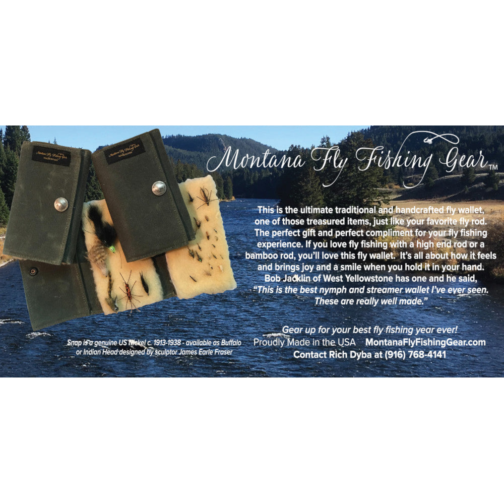 Montana Fly Fishing Gear Fly Wallets, This is a 2 Shearling Panel Fly Wallet, which holds about 300 trout flies. The shearling wool holds flies very securely yet are easily removed. The wallet is made of 18oz waxed canvas twill and there are pockets behind each piece of shearling. Its durable, flexible, water resistant, it floats, and drys quickly. This fly wallet is handcrafted and is a classic alternative to plastic and foam fly boxes that wear out. Our wallet is biodegradable but will last a lifetime.