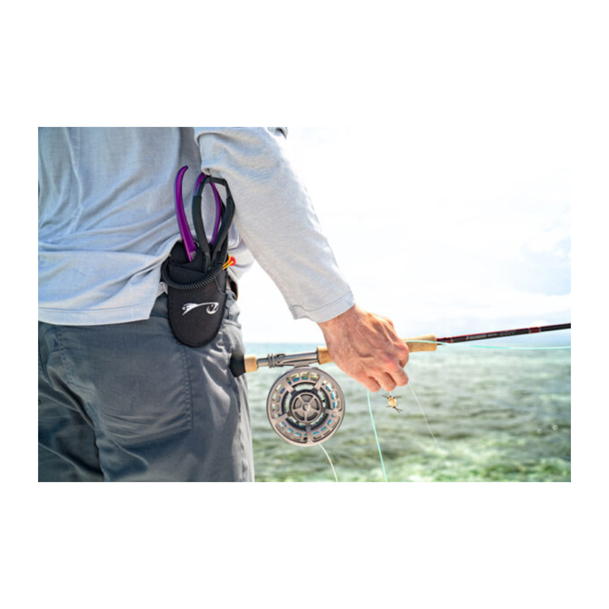Practical, durable, and lightweight way to carry your Lippa4life and any other pair of pliers. The holster had two pockets, one for the Lippa4Life and the outermost for any other pair pliers, a horizontal pocket sewn between the fabric to hold the diamond file, belt loop and metal belt clip, and 10″ coil leash that can extend 6 feet. We use ours in Utah on the rivers in the summer when we are just wet wading in our shorts and wading boots picking off rising Trout. Other anglers wear them stalking the flats for Bonefish, Redfish, or Carp. While still others wear them on their boats as they chase Blues, Stripers, and Permit. Basically if you’re using the Lippa4Life and don’t have it in a pack this is the system. By changing the design of the outermost pocket on the double pocket holster, we made it easier to carry long pliers – even 12″ long. This was an improvement over our first version which had vertical openings on both pockets which would allow long pliers to pop up when you sat down. As you see in the images below, the pliers are on an angle.