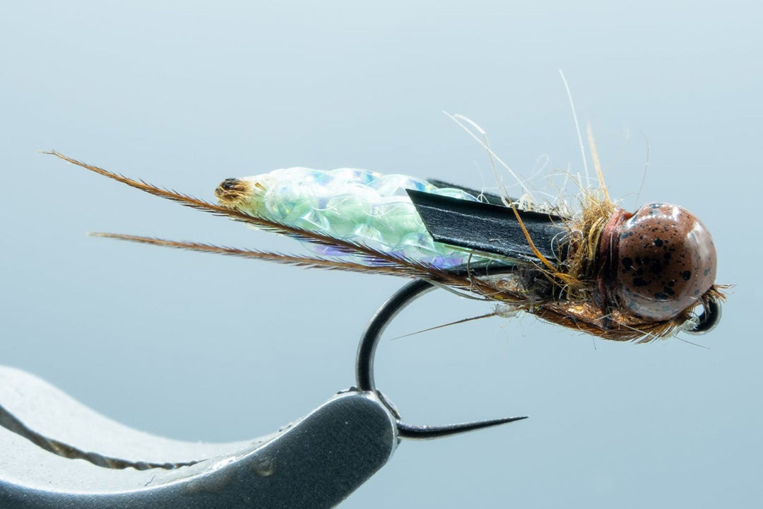 Caddis larva are one of the most prevalent insects in rivers, and are particularly loved by trout. In the real world caddis pupa have dark wing pads and antennae that are very noticeable, and have a body and legs that undulate enticingly in the water. Across the spectrum of the caddis family the pupae vary considerably in color; from light tan, to cinnamon brown, chartreuse greens to dark olive, and all the shades in between. On the water, we have found many an occasion when going a shade lighter (or darker) can make a big difference in your success rate, so having a selection of as many colors as possible makes a lot of sense. RIO's Puparazzi will represent nearly every color of caddis pupae out there. We particularly recommend our unique blue/green pupa color that perfectly matches the Green Rock Worm - a much sought after, and very common caddis pupa around the world. This fly is tied on a barbless jig hook and has a mottled tungsten bead to look as natural as possible, while keeping the fly in the feeding zone. Finally, black wing pads offer a striking contrast to the body color. All-in-all, this has proven to be one of the most effective caddis pupa patterns we have ever designed and tried, and we have found that trout absolutely love this fly - and so will you.