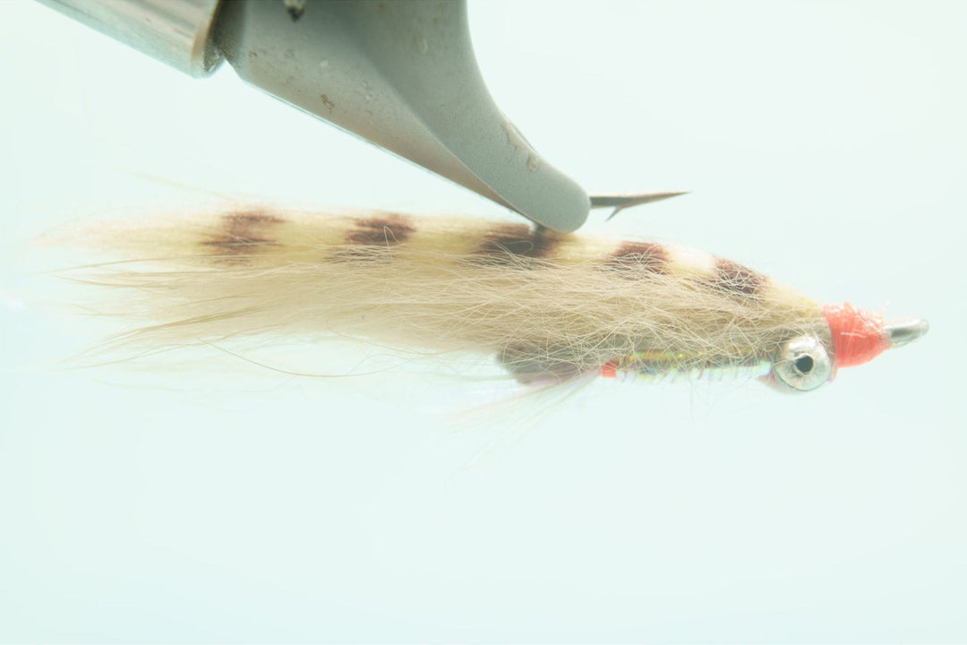 Henry Cowen's Bonefish Scampi was developed in the mid 1990s in the Bahamas for picky and finicky bonefish. Widely fished across the flats of Belize, Mexico, Los Roques, and even the Seychelles. This version is tied with a barred bunny fur wing and bead chain eyes to make it suspend in the water column.