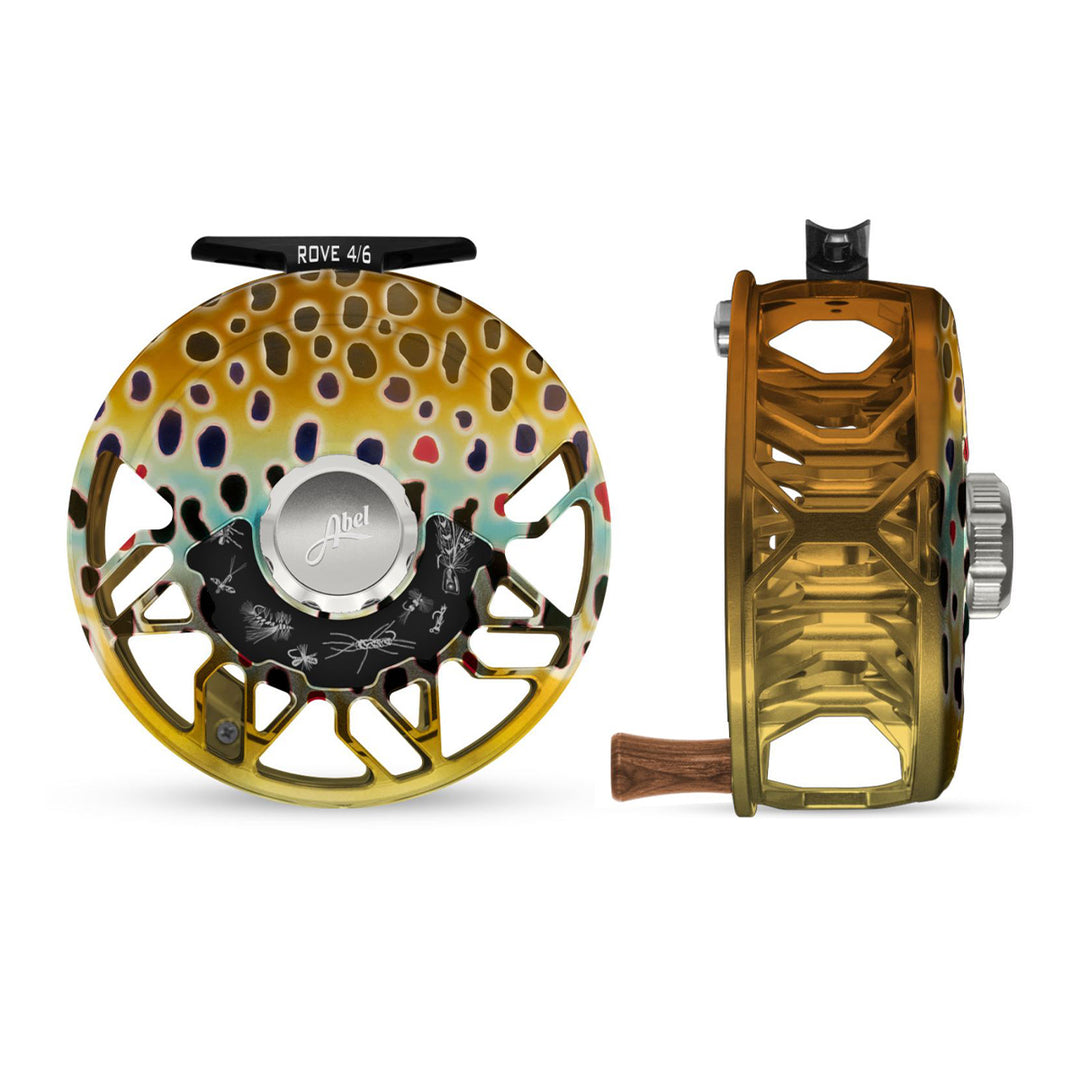 Abel ROVE Reel 4/6 Native Brown, Platinum Drab Knob and Freshwater Flies Engraving with Walnut Handle