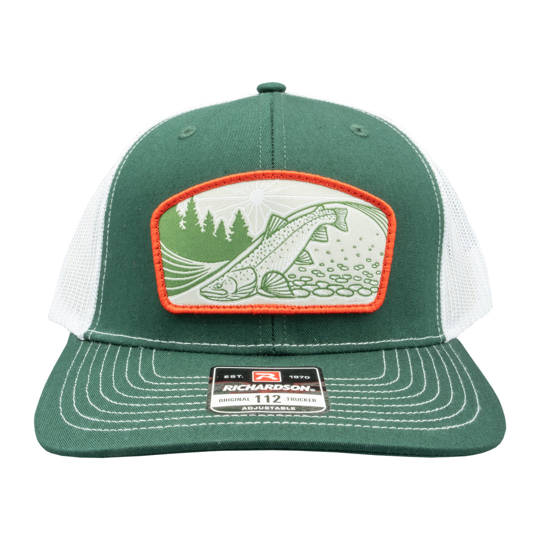 Artwork features a Trout riding the current in a rocky-bottomed river