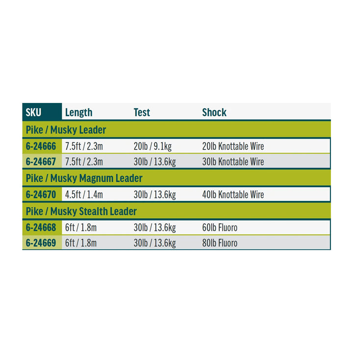 The Pike & Musky leaders are an ultra-stiff nylon leader attached to a tough, bite resistant knottable wire shock tippet or stealthy fluoro configuration that is ideal for Pike, Musky and similar toothy species.