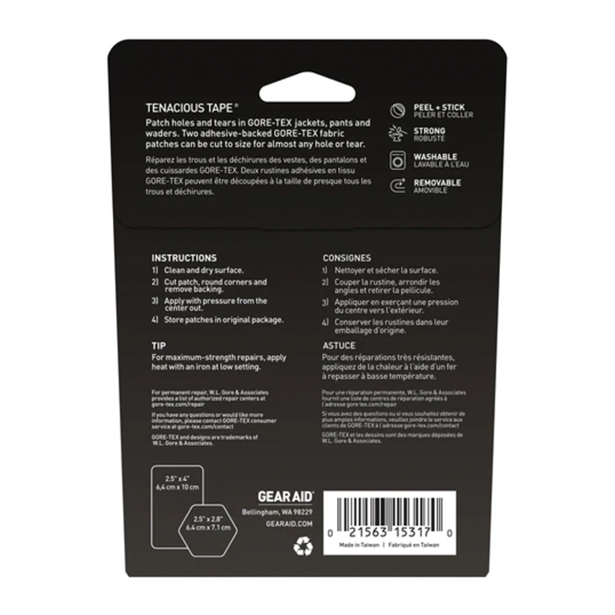 When your GORE-TEX gear gets a tear, patch it with Tenacious Tape GORE-TEX Fabric Patches. This kit contains two adhesive-backed fabric patches. The pressure-sensitive patches can be cut to the size and shape you need for a hole or tear in any gear. The strong patch bonds to the fabric and will not peel off even when washed. Apply low heat with an iron or tumble dry on low for increased adhesion. Use Tenacious Tape GORE-TEX Fabric Patches for a fast in-home or field fix to your GORE-TEX gear.