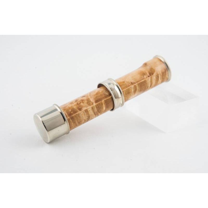 Bellinger .660 Down Lock Slide Band Reel Seat - Nickel Silver, One of our most popular reel seats. A traditional polished nickel silver cap and ring style seat with a mortised spacer. Comes complete with trim ring, sliding ring and end cap and features eased inside edges where the reel makes contact and Bellinger's signature fine straight knurling. Spacer diameter is 0.660", Assembled length is approx. 3.5", .375 inside diameter. Available in both hand rubbed varnish and stabilized wood choices. Image shown is Western Maple with hand rubbed varnish finish.