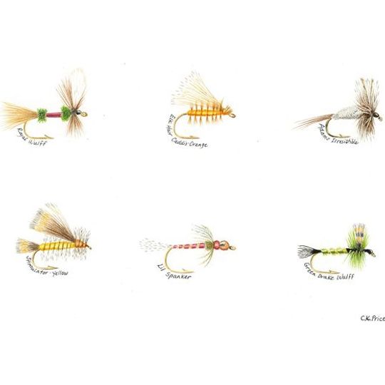 Caroline Price Art 6 Flies 10" x 14" Board w/ Mat, Six beautiful, water-color trout flies on a 10 inch x 14 inch matted board. Can be framed or displayed as is.