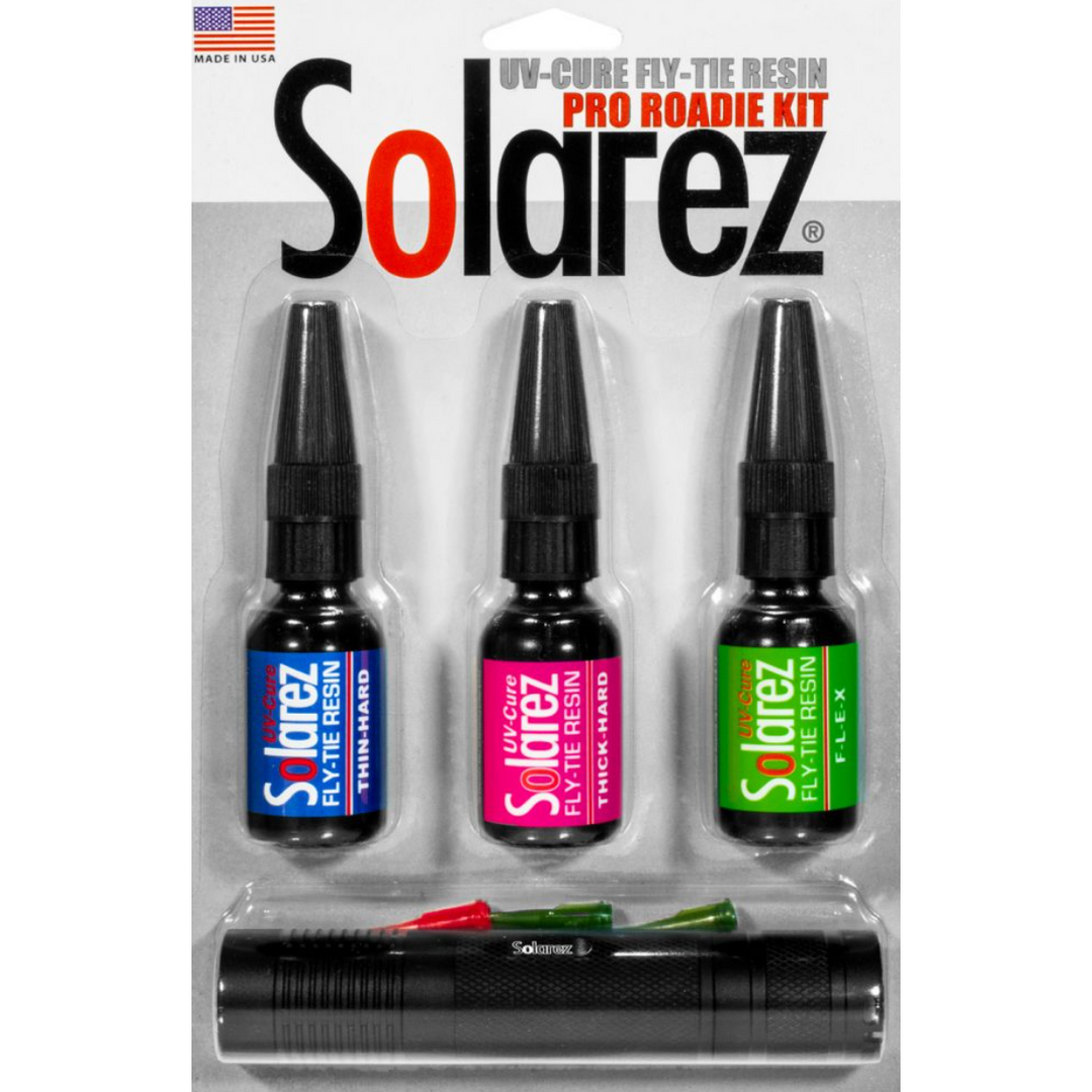 All three of our Solarez fly-tie UV resins; Thin-Hard, Thick-Hard, & FLEX formulas. Each comes in a 1 oz bottle with cone-cap applicator tip – ample for many lures. Also included is a UV-Cure High Output flashlight with optimal wavelength. (this flashlight takes two (2) CR123 Lithium batteries or one (1) 18650 Lithium Ion battery – not included)