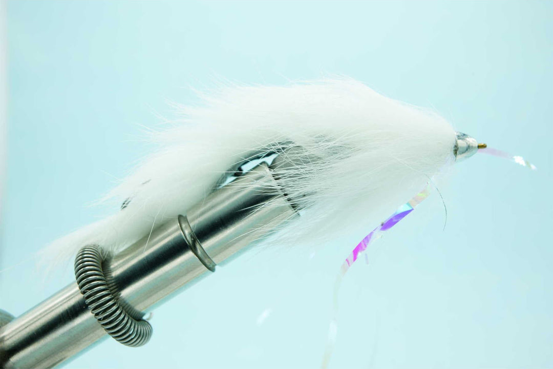 The Dolly became wildly popular in Alaska and should be as staple in any streamer anglers box. it consists of a bunny fur body and tail tied on a shank with a stinger hook trailer and a few strips of holographic flashabou. the conehead helps it get down quick and gives it a jigging action.