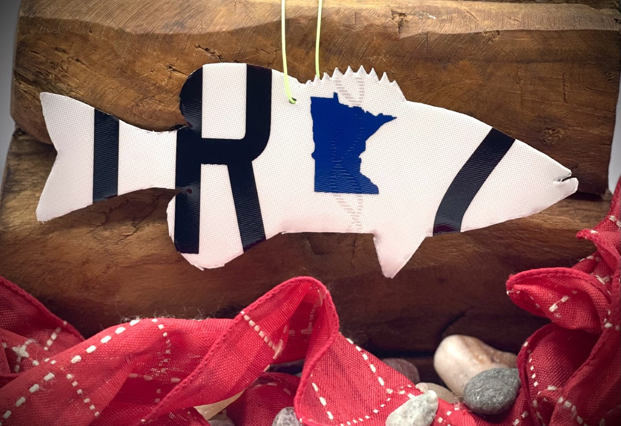 Compliment your holidays with a handmade Minnesota smallmouth bass ornament made out of authentic license plates hailing from the 'Land of 10,000 Lakes'. Each piece is artfully unique due to using a variety of license plates, and is tied with a colorful fly line. This is a great holiday ornament, gift accessory, or accent piece for the fishing enthusiast.  These fish are a limited edition and sell fast, so please place your orders today.