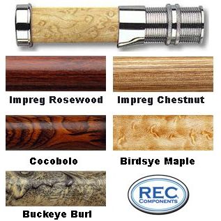 REC "NBM" Nickel Silver Uplock Seat, Features a milled slide band and hood, double knurled nut, butt cap, and fine threaded barrel. Recommended for #2 - 7 line weights. NBM seats have a .375 bore with .421 bore available for an additional $4.95. Available with beautiful impregnated rosewood or chestnut colors or natural cocobolo, birdseye maple or buckeye burl wood inserts. Please specify wood insert and insert bore.