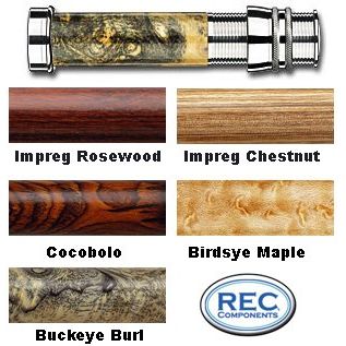 REC "NBS" Nickel Silver Uplock Seat, Features a milled slide band and hood, double knurled nut, butt cap, and fine threaded barrel. Recommended for #2-7 line weights. REC NBS seats have a .375 bore with .421 bore available for an additional $4.95. Available with beautiful impregnated rosewood or impregnated chestnut colors as well as natural cocobolo, birdseye maple or buckeye burl wood inserts. Please specify wood insert and insert bore.