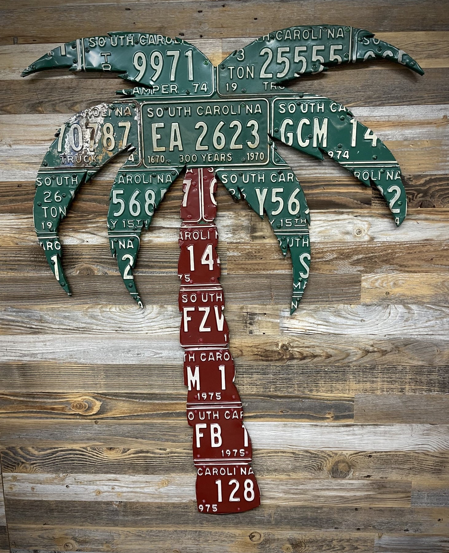 Represent the 'Palmetto Palm Tree State' with this antique South Carolina palm tree. The fronds are made of limited edition green North Carolina plates with a trunk of antique license plates. Each piece is an original and will look similar however not exactly as the picture shown.
